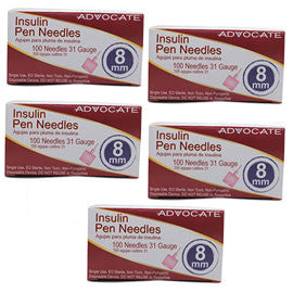 - 100 Advocate Insulin Syringes 31G x 8mm (5/16") Short Pen Needle - Case of 5