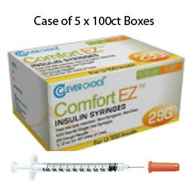 - Case of 5 Clever Choice Comfort EZ Insulin Syringes - 29G U-100 1/2 cc 1/2" - BX 100