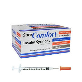 • Box of 100 SureComfort U-100 Insulin Syringes 29g 1/2cc 1/2"
