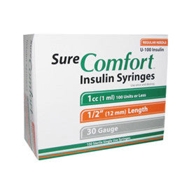 - Box of 100 SureComfort U-100 Insulin Syringes - 30 gauge - 1cc 1/2 inch inch