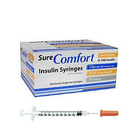 - Box of 100 SureComfort U-100 Insulin Syringes 30g 1/2cc 5/16"